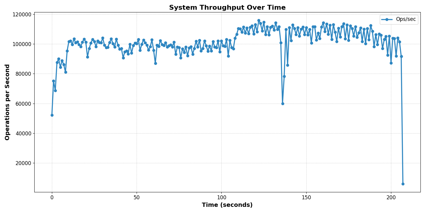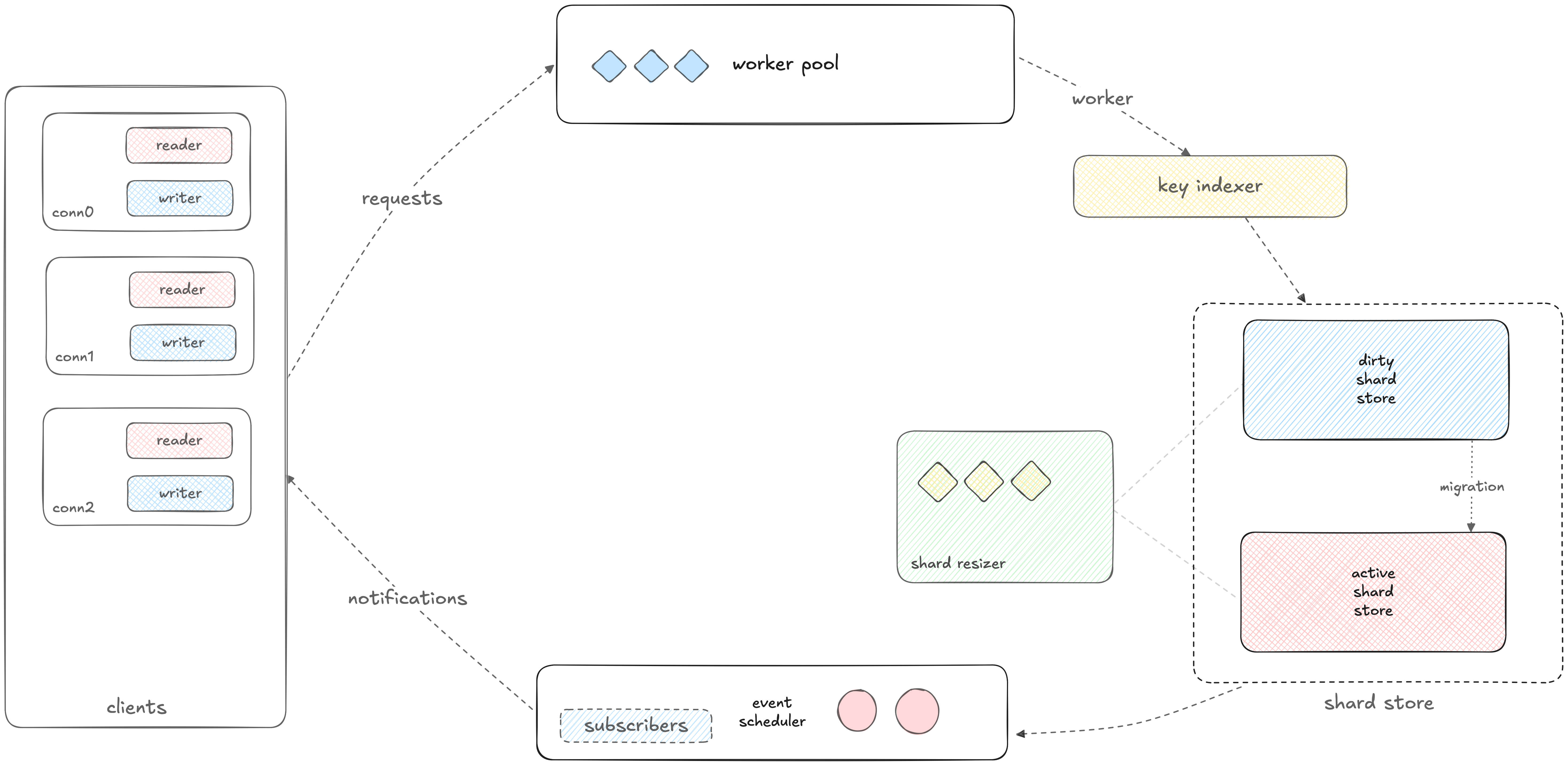 All operations happen in memory. In recent benchmarking, the system achieved 900µs average write throughput and 500µs average read throughput with a million unique keys distributed across 50 clients hammering writes simultaneously.